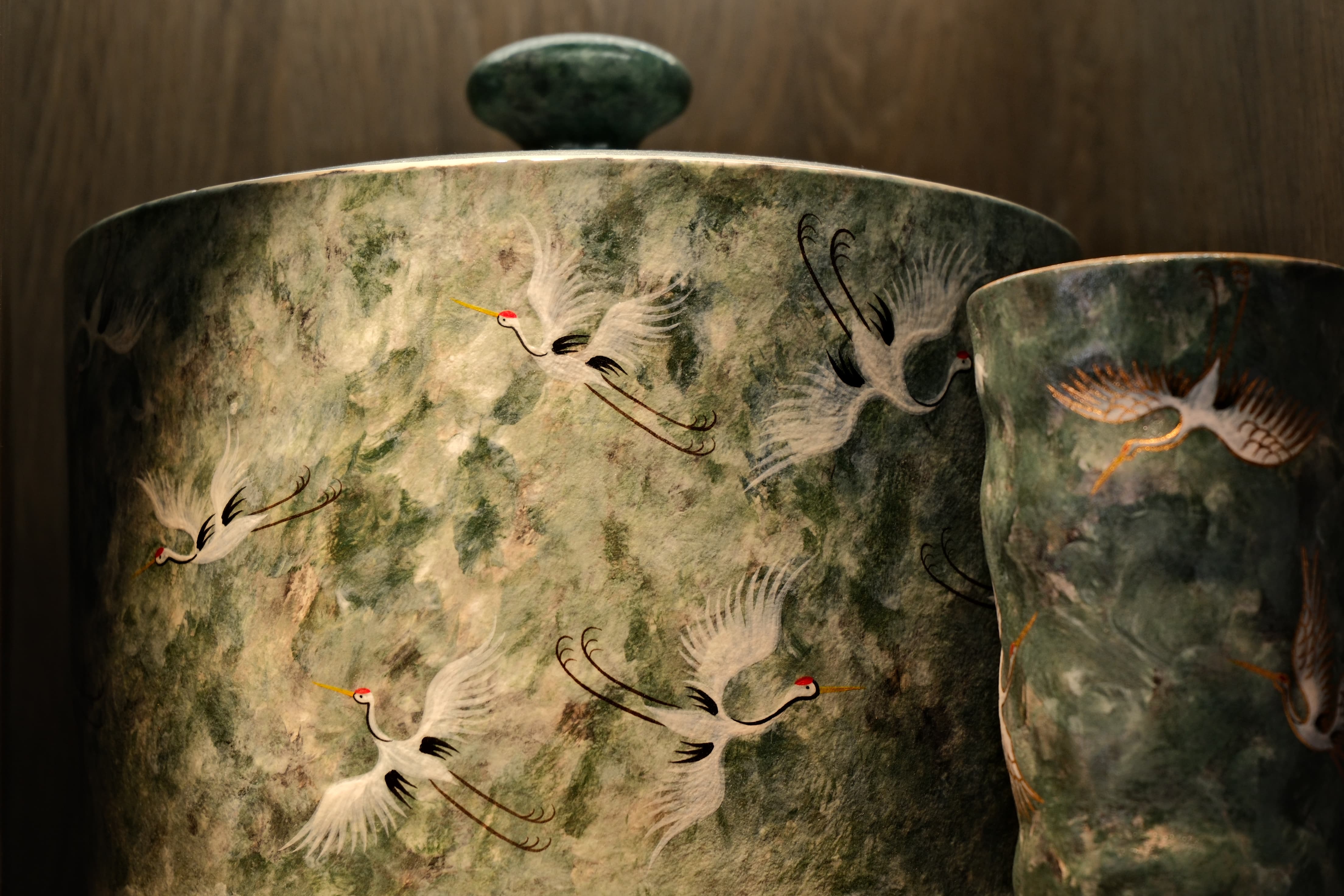 - Hand-painted crane and cloud patterns on green glaze