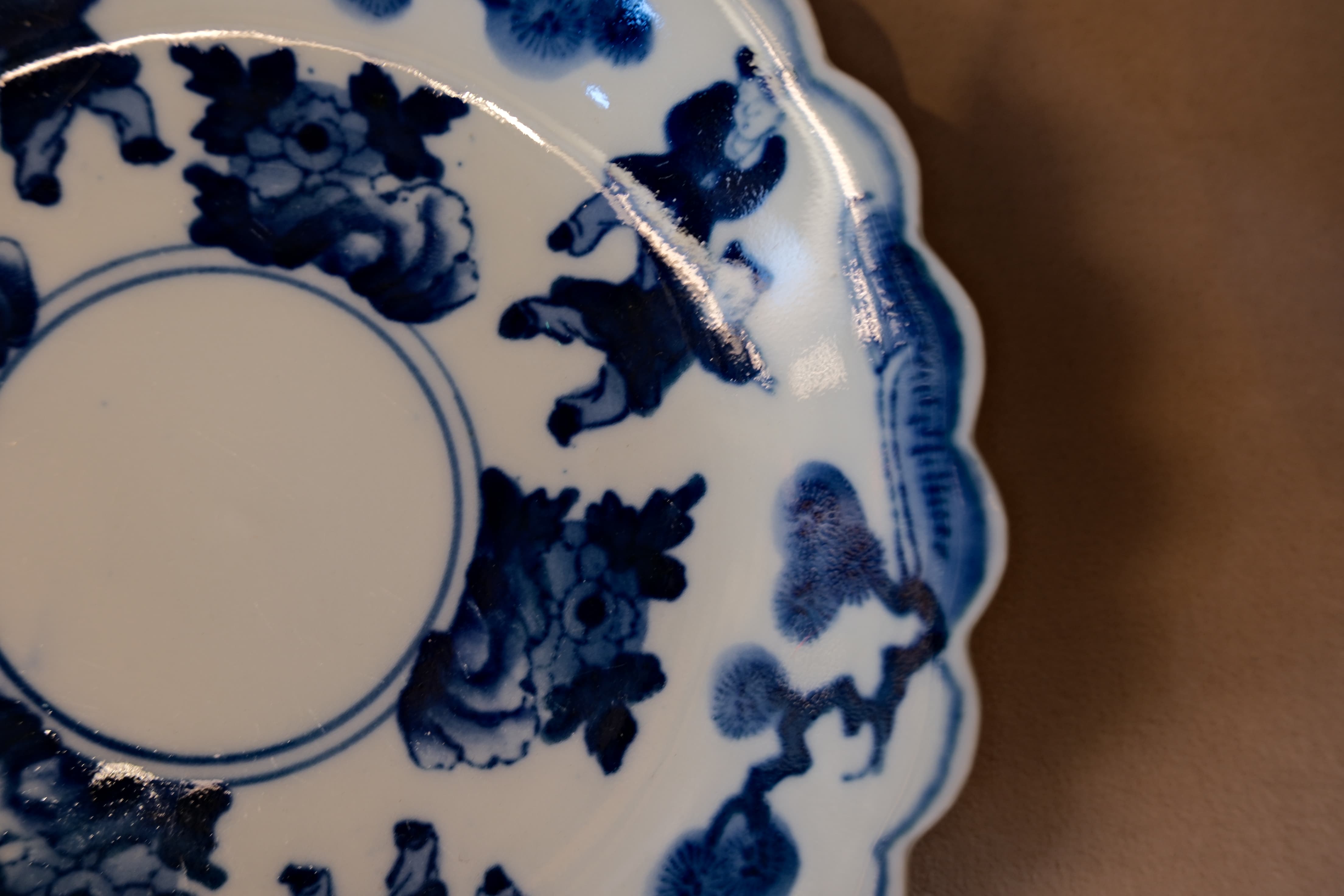 This Japanese antique blue and white porcelain tea drip tray, originating from traditional Japanese craftsmanship, carries the charm of bygone eras and offers both practical use and collectible value. The body is adorned with classic blue and white patterns, featuring a warm glaze and fine, smooth clay that exemplify Eastern elegance. The tray's wide rim effectively catches tea spills, keeping the tea table clean. Its substantial and evenly weighted body provides stable support for the teapot, ensuring secure use. The elegant blue and white motifs add a touch of classical artistry to the tea setting, enhancing its aesthetic appeal. With prolonged use, tea staining can nurture unique crackle patterns (crazing) in the glaze, deepening its character and charm over time.